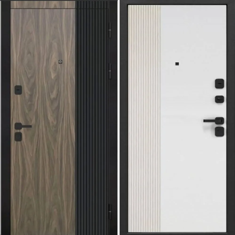 Металл: Порошково-полимерное покрытие, цвет Муар черный Отделка снаружи: лист стали, двухцветная ламинированная МДФ панель 12мм, цвет Орех Американский мокко + Антрацит софт